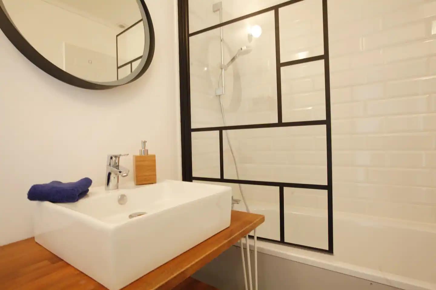 Vous disposerez d’une salle de bain avec une baignoire et un sanitaire dans lesquels gel douche et savon sont fournis pour démarrer votre séjour.